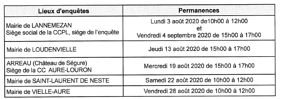 Cette consultation se déroulera du lundi 3 août au vendredi 4 septembre 2020 inclus jusqu’à 17h30. Les lieux de la consultation sont situés au siège social de la CC Aure Louron et à celui de la CC du Plateau de Lannemezan, ainsi que dans les Mairies de Loudenvielle, Saint-Laurent-de-Neste et Vielle-Aure.