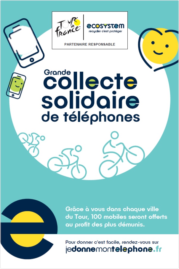 Les 35 villes étapes du Tour de France sont associées à ce grand élan de solidarité en participant à la collecte des téléphones. Sur chaque ligne de départ et d’arrivée, les équipes Ecosystem déploieront un dispositif de sensibilisation pédagogique et ludique autour du thème de l’économie circulaire.