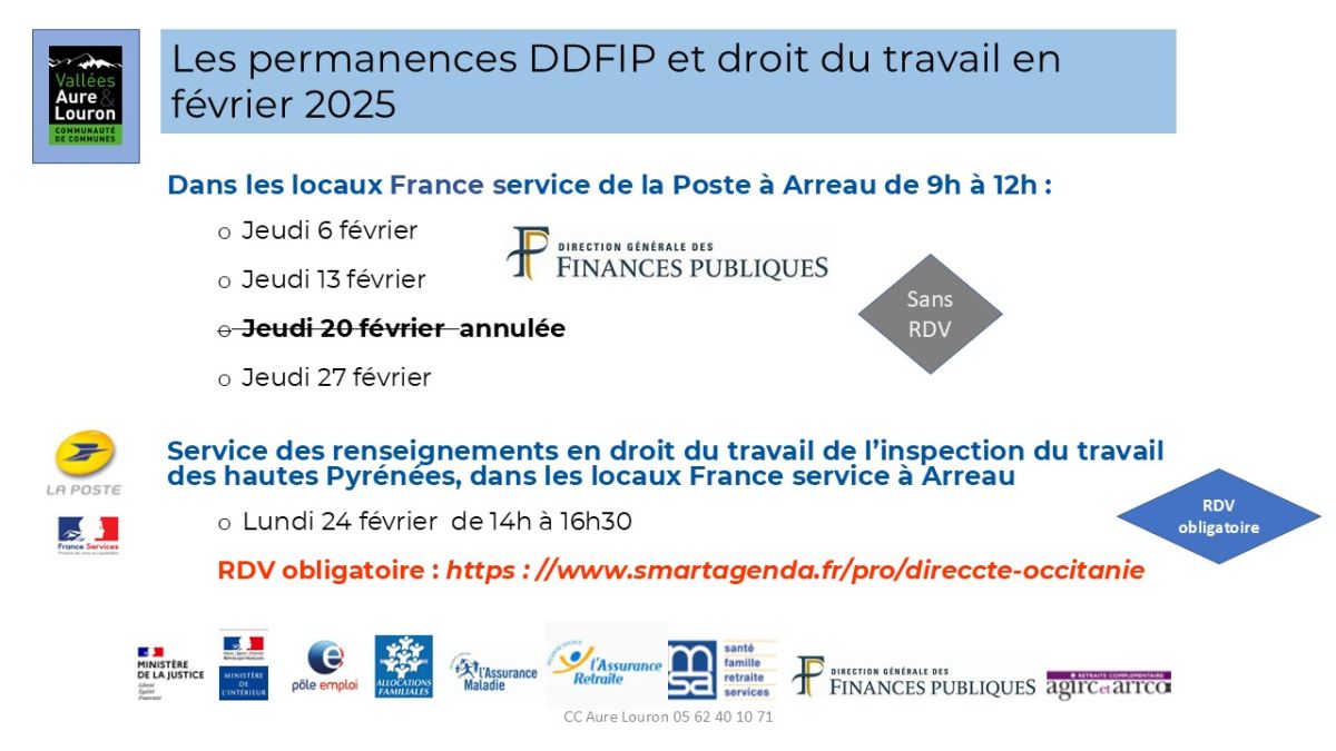 Les permanences en Février 2025 : DDFIP, Renov'Occitanie, OPAH, France Services, Maison du travail saisonnier, CIDDF, Mission Locale, Accompagnement social
