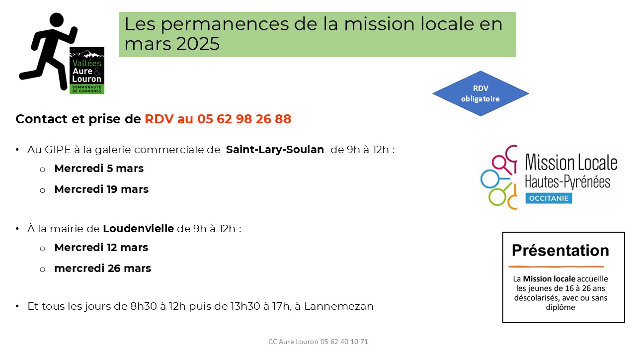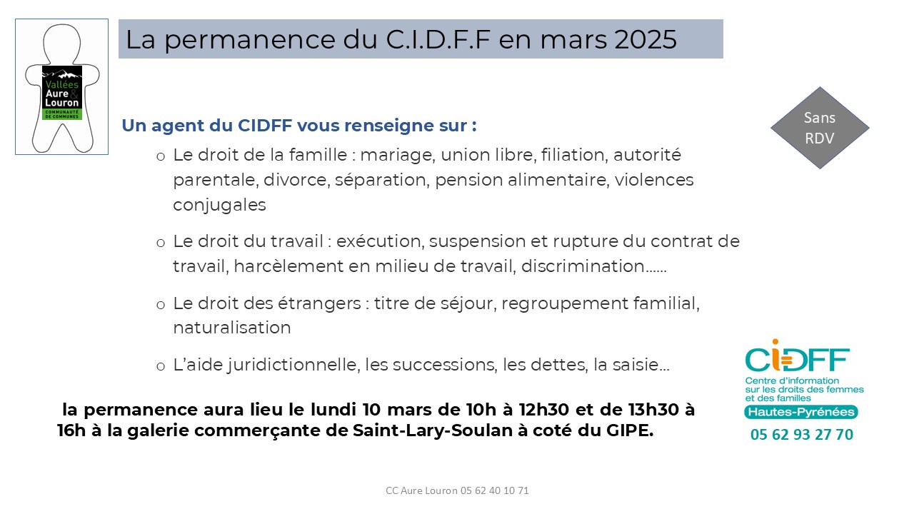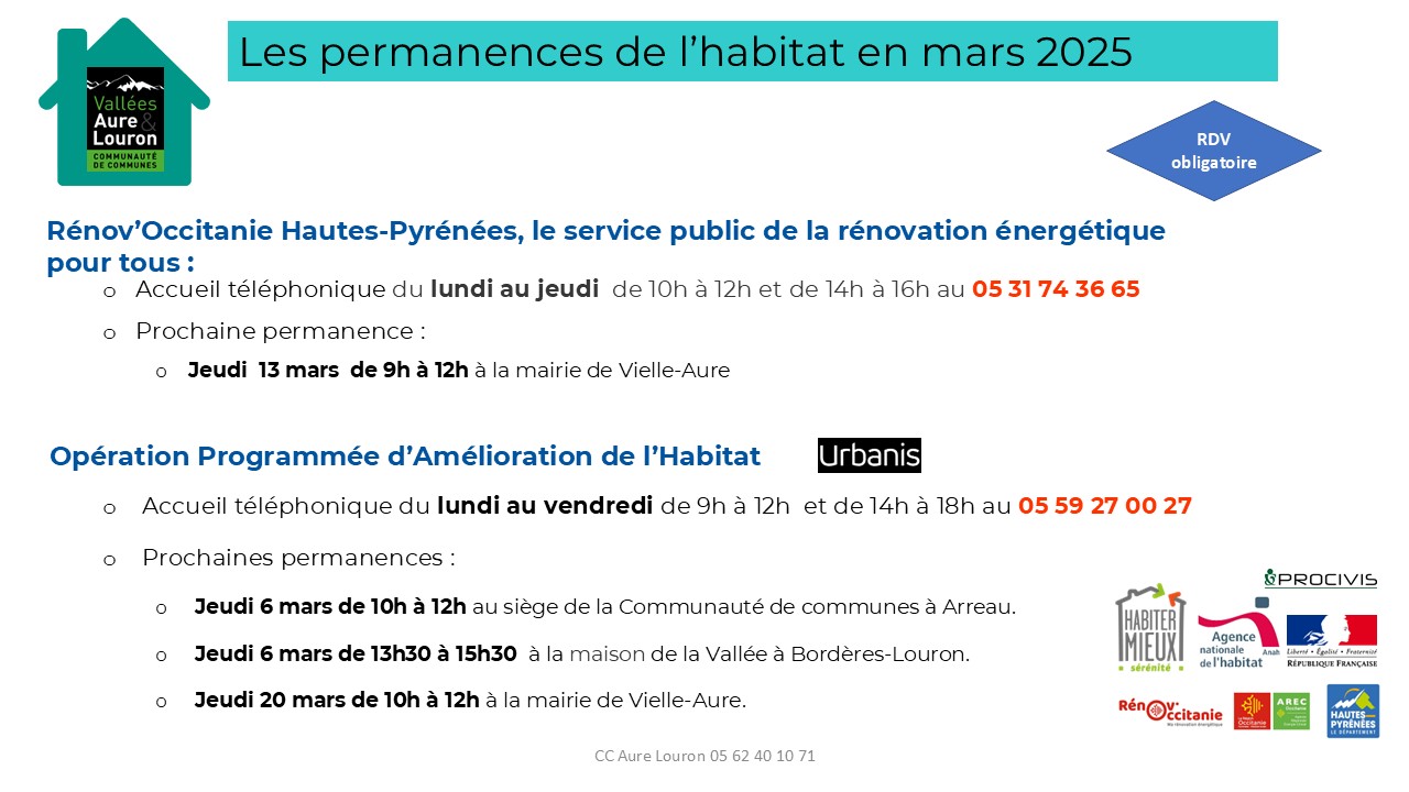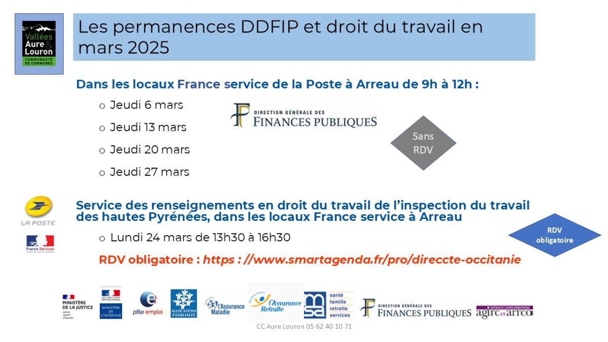 Les permanences en Mars 2025 : DDFIP, Renov'Occitanie, OPAH, France Services, Maison du travail saisonnier, CIDDF, Mission Locale, Accompagnement social