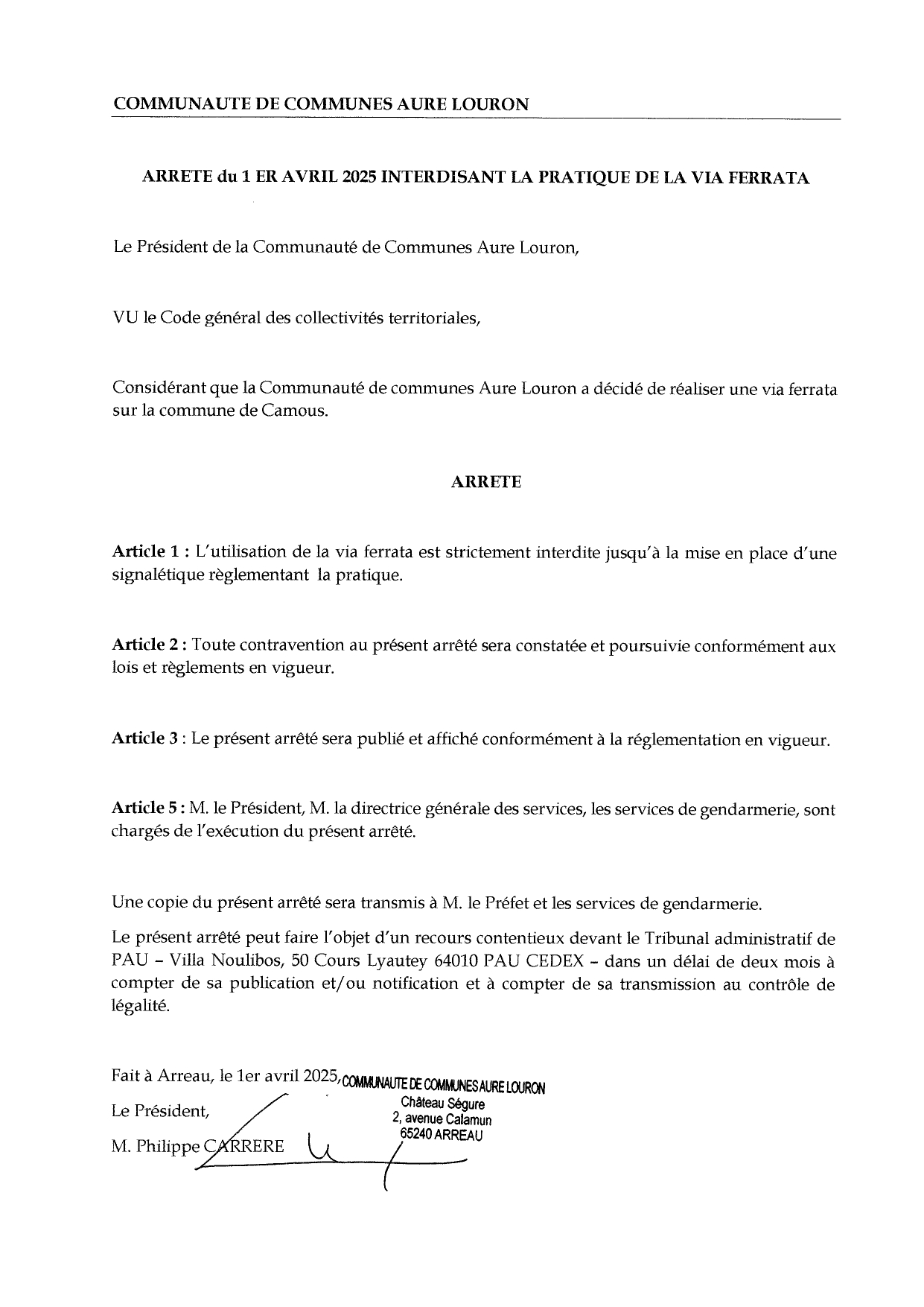Arrêté interdisant la pratique de la Via Ferrata de Camous