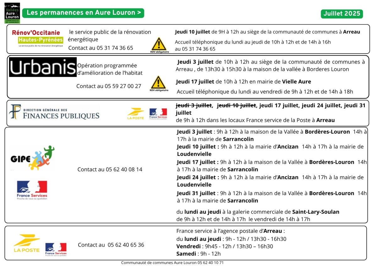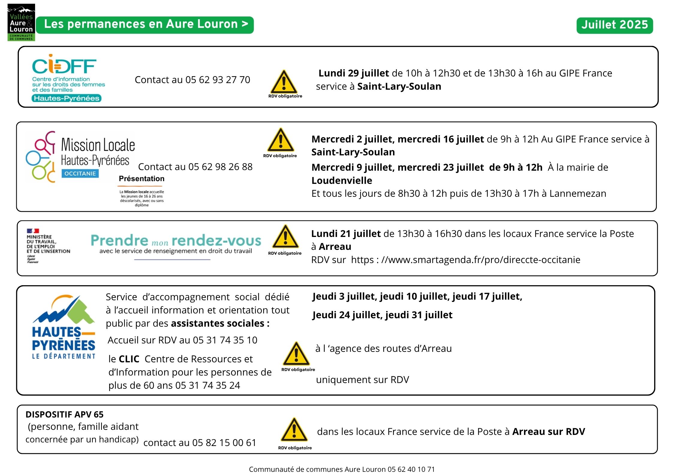 Les permanences en Juillet 2025 : DDFIP, Renov'Occitanie, OPAH, France Services, Maison du travail saisonnier, CIDDF, Mission Locale, Accompagnement social