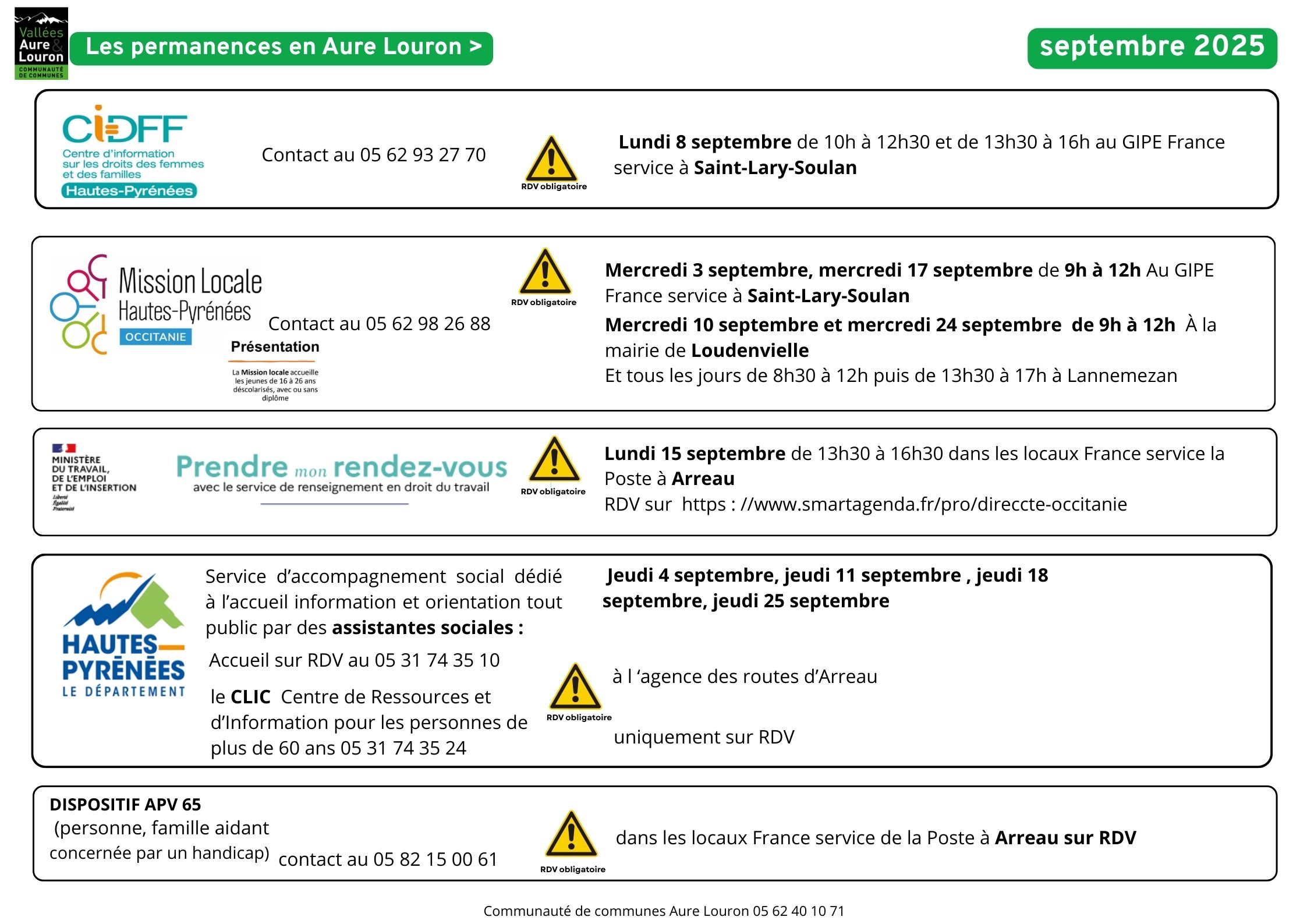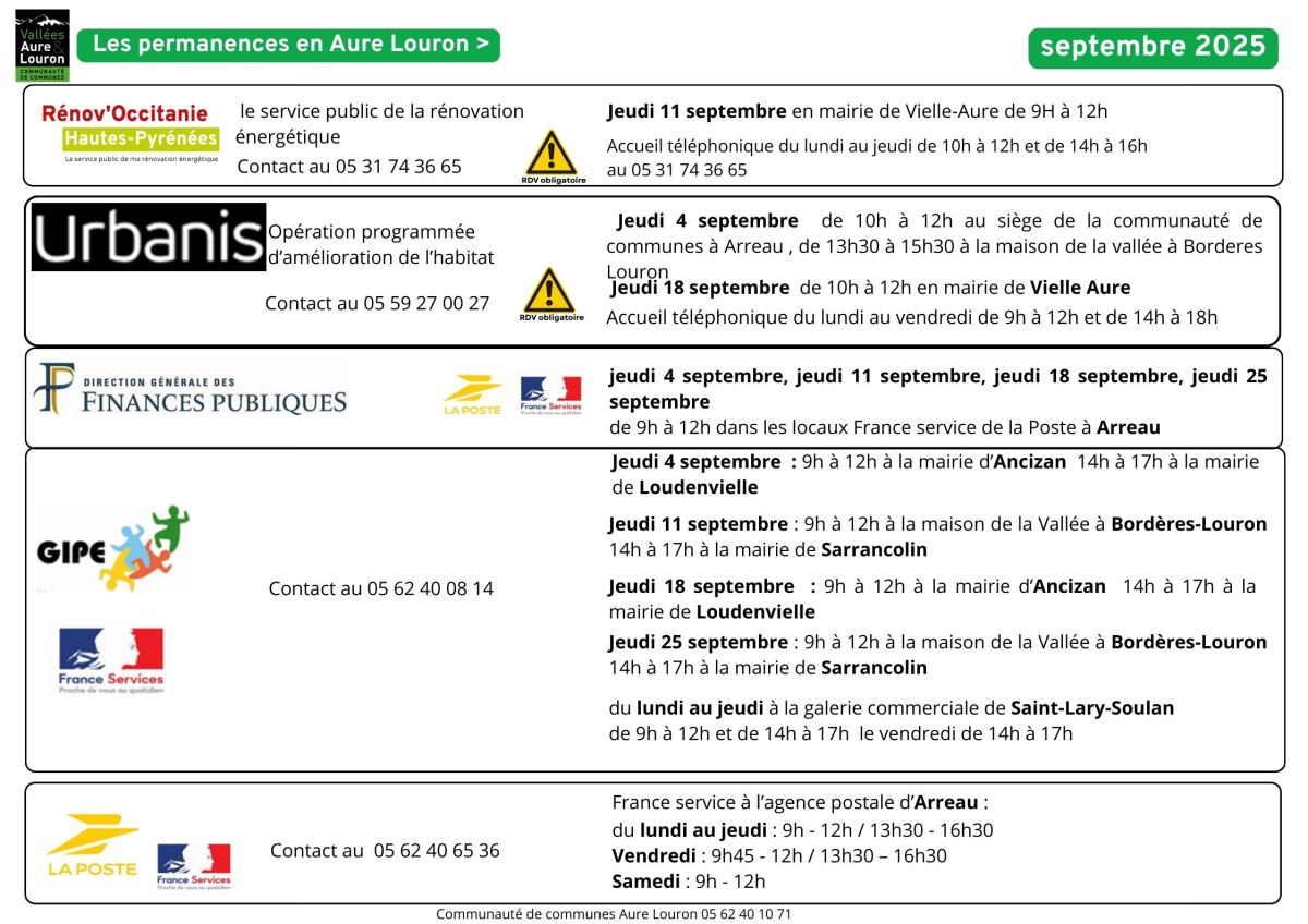 Les permanences en Septembre 2025 : DDFIP, Renov'Occitanie, OPAH, France Services, Maison du travail saisonnier, CIDDF, Mission Locale, Accompagnement social