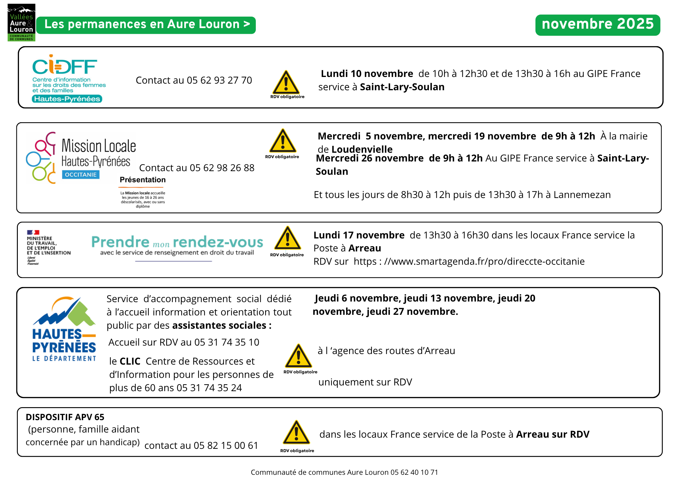 Les permanences en Novembre 2025 : DDFIP, Renov'Occitanie, OPAH, France Services, Maison du travail saisonnier, CIDDF, Mission Locale, Accompagnement social